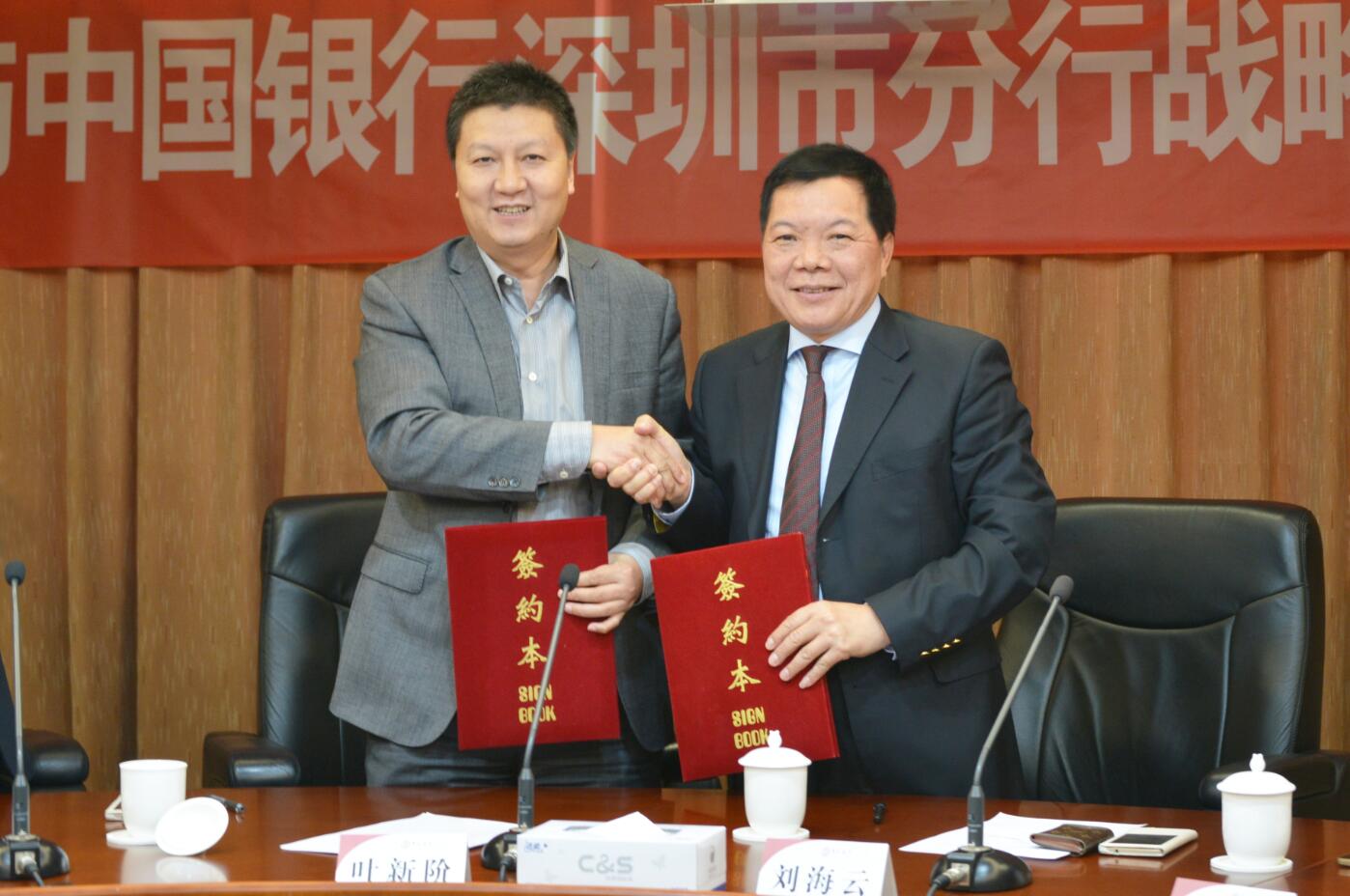 建藝集團董事長兼總裁劉海云(右一)與中國銀行深圳市分行副行長葉新階(左一)