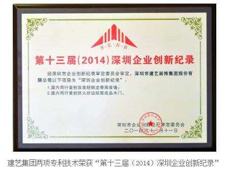 日前,建藝集團在深圳工業總會及深圳市企業創新記錄組織委員會共同舉辦的“第十三屆深圳企業創新記錄”評選中,一舉奪得“自主創新企業金獎”榮譽,為企業在科技創新領域的發展增添新輝。另外,建藝集團兩項創新專利技術——“雙層輕鋼龍骨隔音墻”及“防火折邊貼面成品木門”更是榮獲“第十三屆(2014)深圳企業創新記錄”獎,經審定委員會審定,建藝集團的這兩項技術均為國內同行首創。
