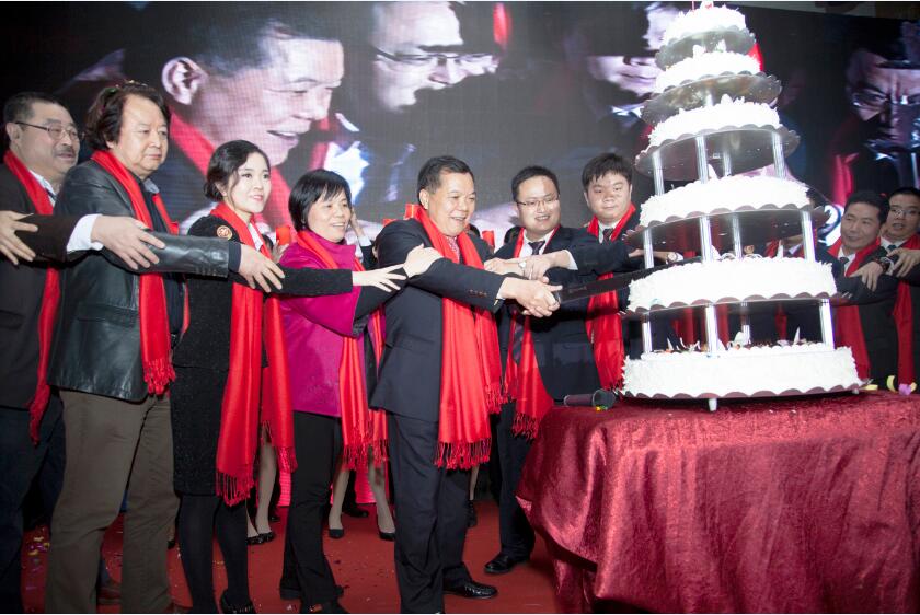 建藝集團董事長劉海云(左五)與全體集團高管共同切下企業(yè)二十周年華誕蛋糕