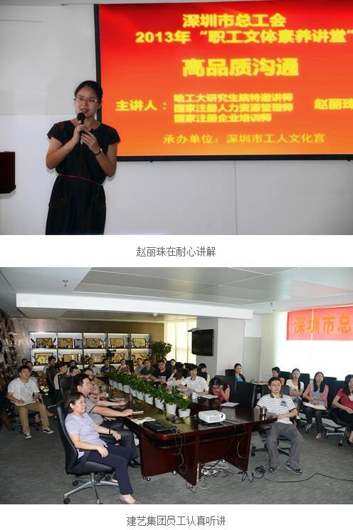 為了提升集團總部員工的溝通能力,提高各部門、各個職員的工作效率,2013619日下午,深圳市總工會2013年“職工文體素養講堂”走進建藝集團,并特別邀請哈爾濱工業大學研究生院講師、國家注冊人力資源管理師趙麗珠為集團總部全體員工開展了一次高品質溝通培訓課程。