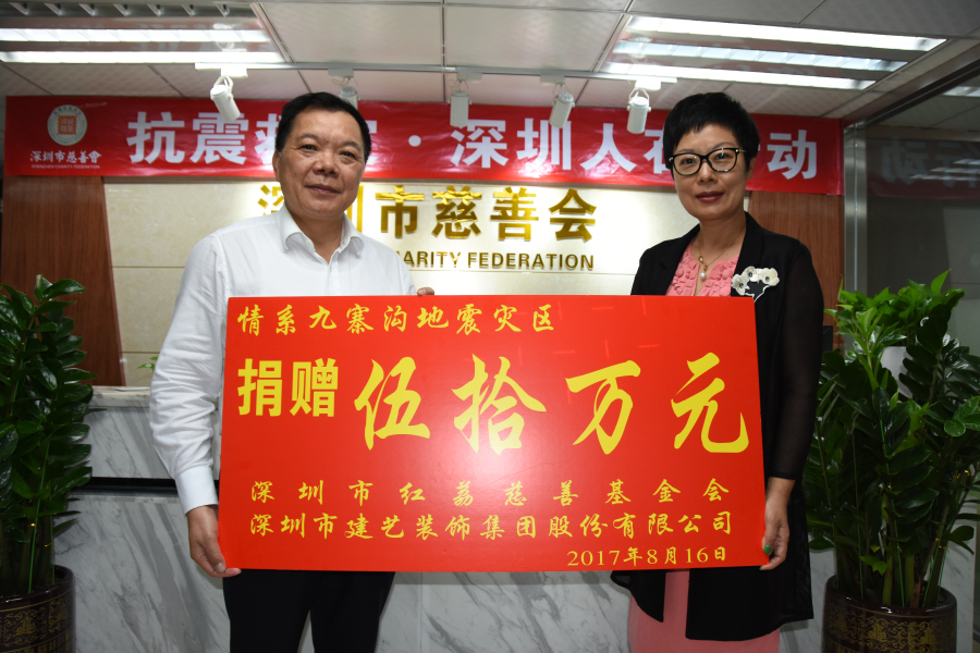 2017年,劉海云董事長代表建藝集團(tuán)及紅荔慈善基金會向九寨溝災(zāi)區(qū)捐款50萬元
