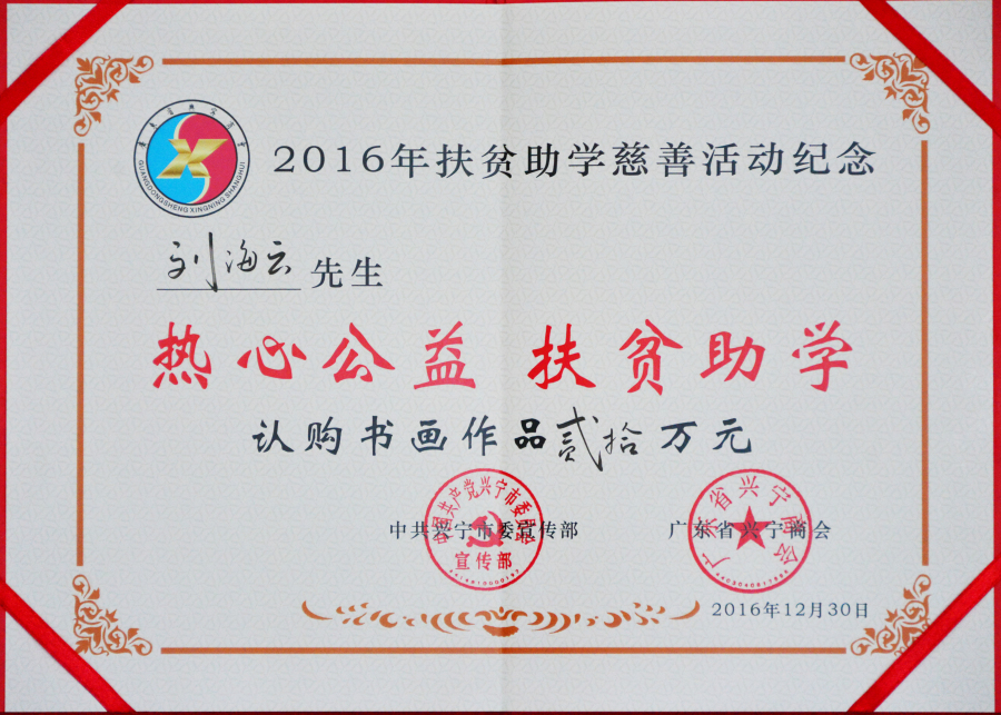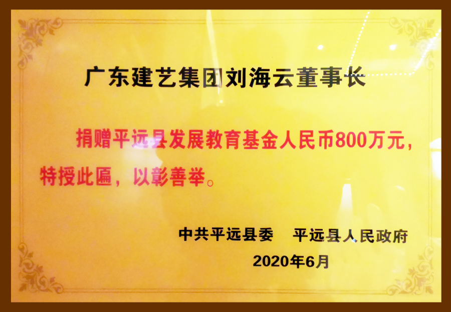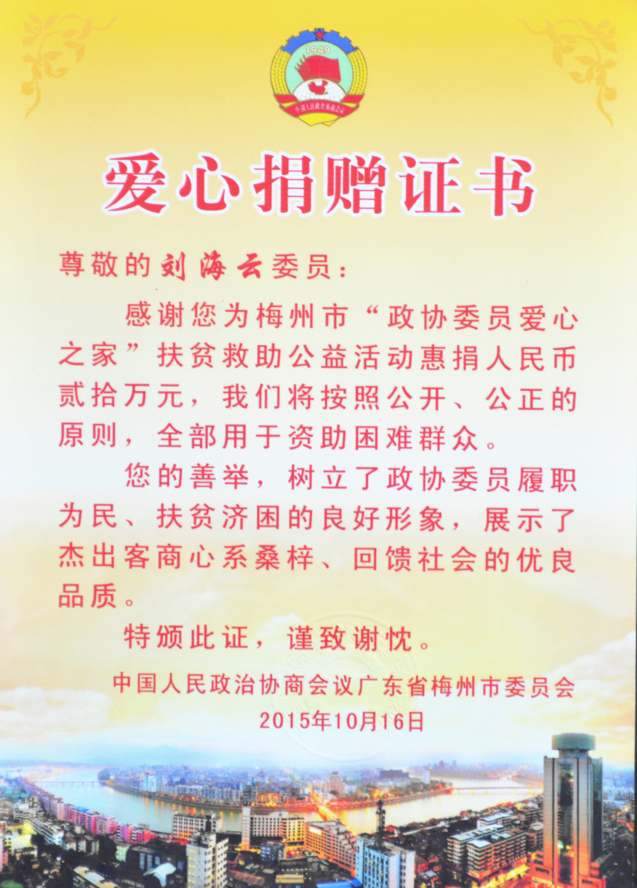 2013年,劉海云董事長為廣東省梅州市捐資20萬元,用于解決當(dāng)?shù)匾驗(yàn)?zāi)受毀的基礎(chǔ)設(shè)施重建工作;2015年,劉海云董事長為梅州市扶貧救助公益活動捐資20萬元,資助當(dāng)?shù)氐睦щy群眾,并改善當(dāng)?shù)亟虒W(xué)條件;2016年,在廣東省興寧商會成立慶典大會——百余名書畫名家捐贈作品義賣活動中,劉海云董事長認(rèn)購書畫作品20萬元,用于資助興寧市貧困學(xué)生;2017年,作為政協(xié)廣東省梅州市七屆常委,劉海云董事長代表梅州市“政協(xié)委員愛心之家”為當(dāng)?shù)乩щy群眾送愛心,將愛心款5000元交到《梅州日報》記者手上,并委托《梅州日報》欄目組轉(zhuǎn)交給身患尿毒癥的豐順縣湯西鎮(zhèn)大羅村村民黃文強(qiáng)手中,表達(dá)了市政協(xié)和委員的關(guān)愛;作為政協(xié)常委,劉海云董事長還積極捐資20多萬元,為青華村1.5公里主村道安裝LED路燈,極大地方便了當(dāng)?shù)卮迕竦囊归g出行,也為當(dāng)?shù)卮迕窀熳呱现赂宦纷龀隽素暙I(xiàn);2019年,在2019年度“廣東扶貧濟(jì)困日”活動中,劉海云董事長再次伸出援手,向平遠(yuǎn)縣仁居鎮(zhèn)捐贈善款100萬元,用于支持當(dāng)?shù)氐缆窐蛄航ㄔO(shè);2020年,新冠肺炎疫情席卷廣東,劉海云董事長第一時間指示相關(guān)人員向平遠(yuǎn)縣紅十字會援助1萬只口罩,同時分別向梅州市政協(xié)及興寧市人民政府捐款20萬元及10萬元,以解廣東梅州、興寧、平遠(yuǎn)等地疫情防控當(dāng)務(wù)之急;同年,在平遠(yuǎn)縣發(fā)展教育基金會成立暨捐贈儀式上,劉海云董事長向基金會慷慨捐贈800萬元善款,助力廣東平遠(yuǎn)當(dāng)?shù)刎毨W(xué)子完成學(xué)業(yè)、教育系統(tǒng)貧困教職工擺脫生活困苦狀況,并促進(jìn)平遠(yuǎn)教育事業(yè)全面發(fā)展。