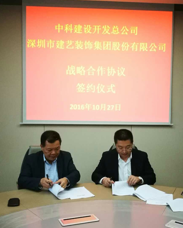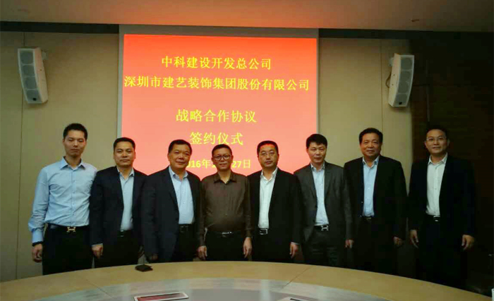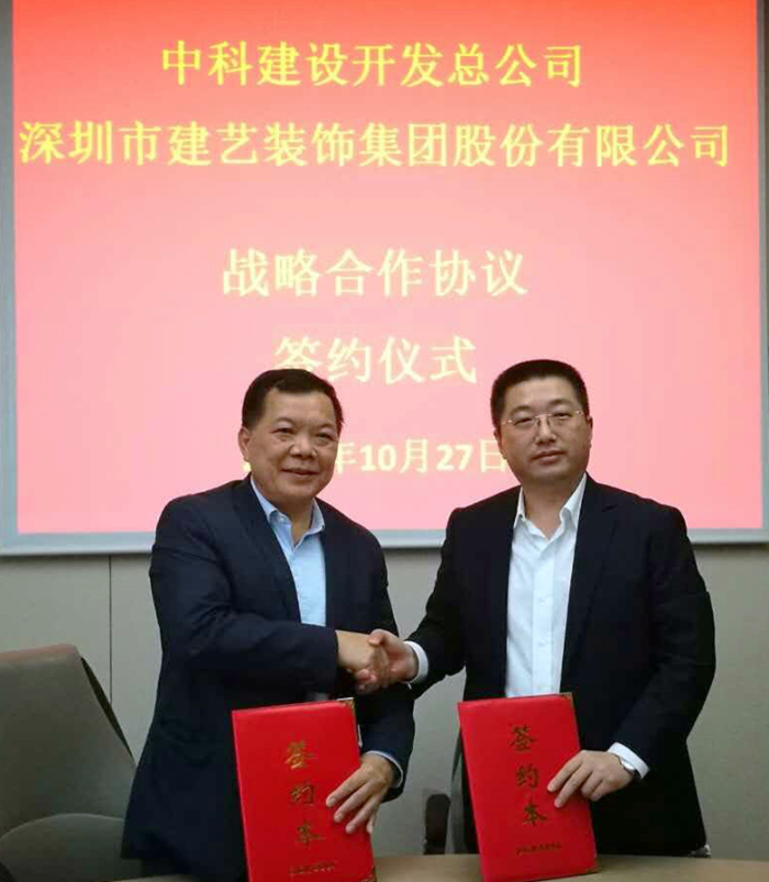 10月27日,深圳市建藝裝飾集團股份有限公司與中科建設開發總公司戰略合作簽約儀式在上海中科建設總部舉行。建藝集團董事長兼總裁劉海云、副總裁劉慶云、副總裁兼董事會秘書高仲華,以及中科建設黨委書記董生聚、總經理顧瑋國、黨委副書記徐友法、中科建設供應鏈管理發展(上海)有限公司董事長張友進等雙方領導共同出席簽約儀式。