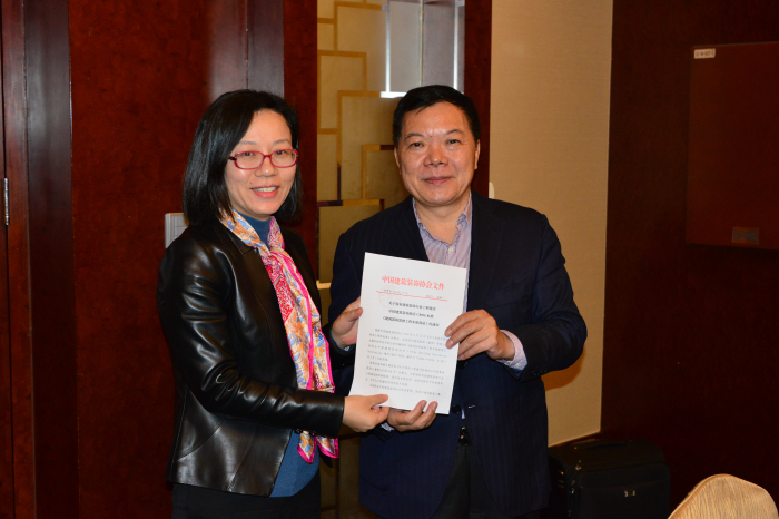 建藝集團董事長兼總裁劉海云作為中國建筑裝飾協會副會長,向深裝集團總工程師王欣頒發由其主編的標準《建筑裝飾裝修工程木質部品》順利發布的通知。