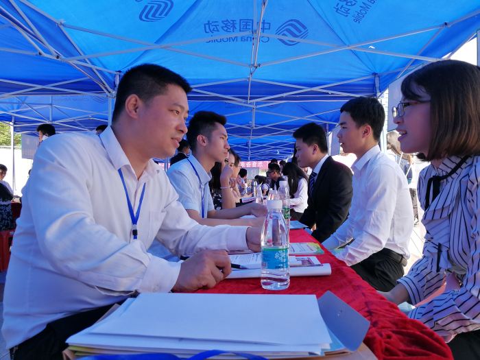 建藝集團(tuán)人力資源部人員在招聘展位面試求職者