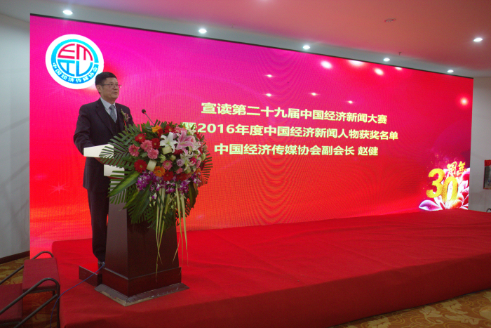中國經濟傳媒協會副會長趙健宣讀第二十九屆中國經濟新聞大賽暨2016年度中國經濟新聞人物獲獎名單