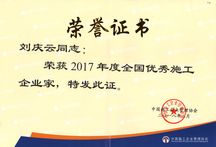 作為中國施工企業管理協會會員單位,建藝集團參與了此次評優活動,并獲得了“全國優秀施工企業”稱號及證書,集團領導劉慶云則獲得了“全國優秀施工企業家”稱號及證書。