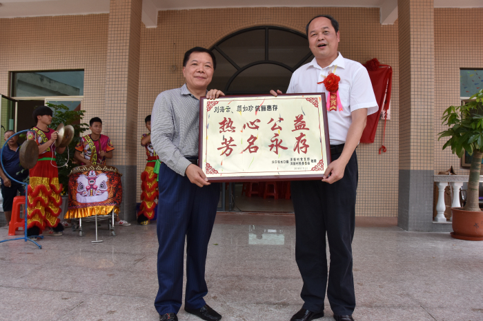 為表彰劉海云夫婦的大愛精神,廣東省梅州市政協副主席李忠良為他們頒發“熱心公益,芳名永存”牌匾。
