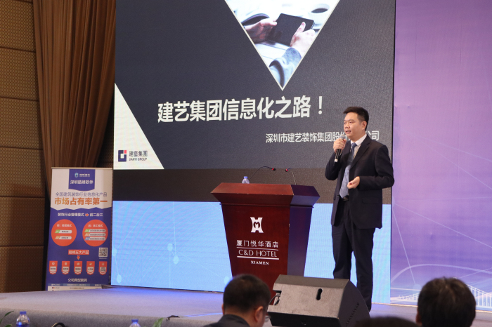 大會期間,以信息化建設為主題的龍頭企業分享環節備受關注。作為行業領軍企業,建藝集團在信息化道路上走出了一條獨具特色的發展之路。集團副總裁趙紂瑜以此為切入點,登臺發表了主題為《建藝集團信息化之路》的主題演講。