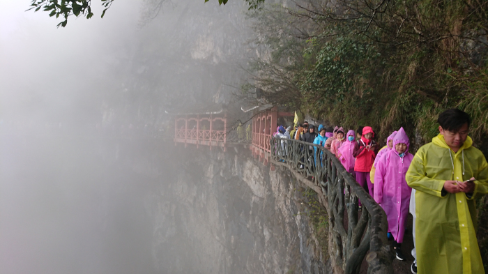 四月的天,喜怒無常,讓人琢磨不透。登天門山前往玻璃棧道與鬼谷棧道的過程中,山上風(fēng)雨交加,云霧蒙蒙。整個天門山系就猶如含羞的少女,猶抱琵琶半遮面,隱藏在煙雨中。而此時此刻的天門山頂景區(qū),也宛如仙境一般迷人。置身于云霧中的建藝人,穿著五顏六色的雨衣,在云雨中彼此攜手結(jié)伴,奮勇前進,成為了景區(qū)的一道“獨特風(fēng)景線”。