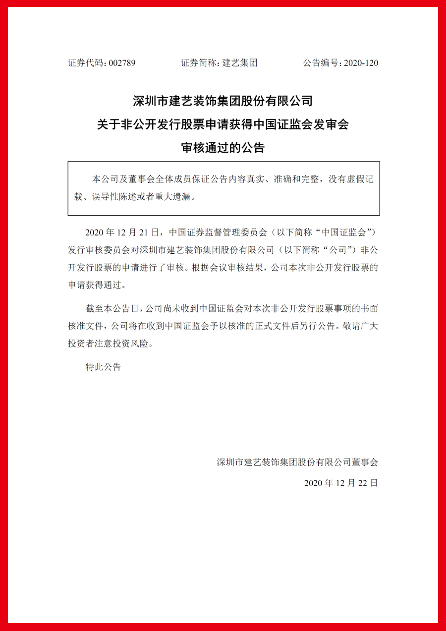 《建藝集團關于非公開發行股票申請獲得中國證監會發審會審核通過的公告》