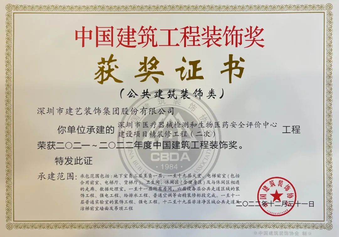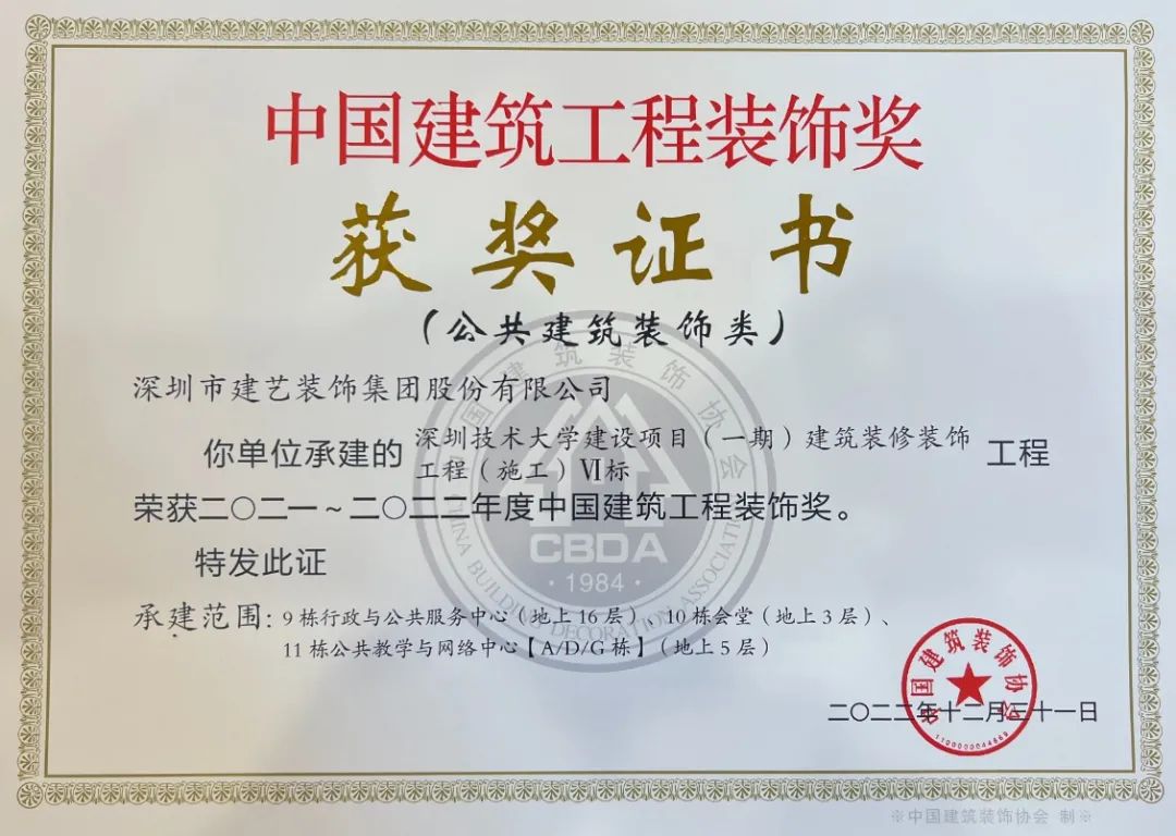 3月23日,由建藝集團參建的深圳技術(shù)大學(一期)建筑裝修裝飾工程Ⅵ標段(簡稱深圳技術(shù)大學項目)和深圳市醫(yī)療器械檢測和生物醫(yī)藥安全評價中心項目(簡稱深圳藥檢大廈項目)再獲殊榮,榮獲由中國建筑裝飾協(xié)會評選頒發(fā)的全國建筑裝飾行業(yè)最高榮譽獎項——“中國建筑工程裝飾獎”。