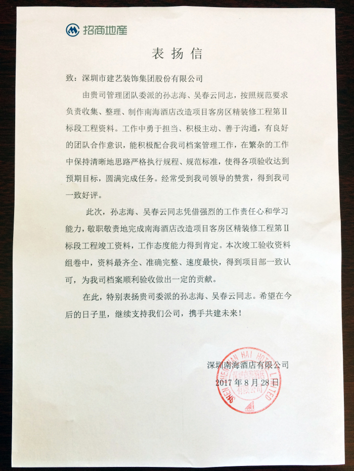 日前,在南海酒店改造項目客房區精裝修工程第二標段工程資料收集、整理、制作工作中,建藝集團工程管理中心孫志海、吳春云充分發揚建藝人嚴謹務實的工作作風,以強烈的責任心完成全部工作內容,獲得了項目部的一致認可,并受到深圳南海酒店有限公司的通報表彰。