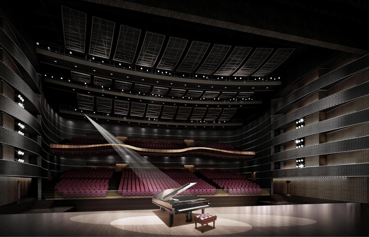 西區多功能演播廳是目前亞洲最大的專業演播廳,其專業舞臺面積達3600㎡,觀眾席1800座,其中固定坐席300座,劇場面積約9000㎡。運用了香檳色的剛質金屬張立構造網來作為主立面表層裝飾主材,大氣而舒展,其良好的穿透性,保證了其后面聲設計構造作用的最大發揮,使聲音的吸收與反射結構都巧妙地隱藏在統一的網層下,在立面上形成獨特的雙表皮裝飾造構,紅色的聲學造構內襯與香檳的金屬網在燈光的映射下,從不同角度折射出不同的光暈表情,使室內空間充滿韻味。在天花的裝飾設計上,同樣遵循了聲學設計的要求,在保證空場混響時間指標的前提下你在反射區域和吸收區域巧妙地進行裝飾,使用弧型的鋁質張立網懸吊構造,其黑色輕盈的造型與紅色厚重的GRG聲學反射板相融合,讓觀者在視覺與感觀上產生一種沖撞與對比的感受,并且兩種形態又能很好的融合在整體的天花造型中,實現了天花裝飾設計上功能性與美觀性的和諧統一。