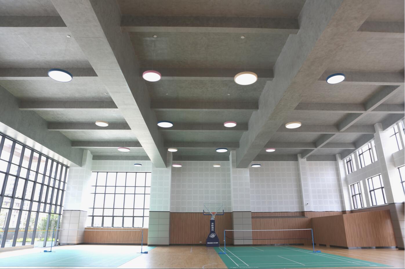 多功能廳頂面采用菱形吸音板造型獨特,每塊板單獨下料,立體拼裝,拼縫細致,聲學效果突出;多功能廳屋面為種植屋面,體現綠色建筑理念;風雨操場二層及屋面跨度為34.4米,最大層高10.2米,風雨操場地面采用體育專用實木地板,光潔平整,接縫嚴密;墻面采用木質吸音板及石膏吸音板,石膏吸音板擁有自重輕、剛度好等特點,完全滿足設計吸音效果;天花采用一種清水混凝土施工工藝,施工中我們采用徒手拍擊的施工方法,形成獨特的圖案,每一塊板上的花紋都獨一無二,卻又和諧統一。