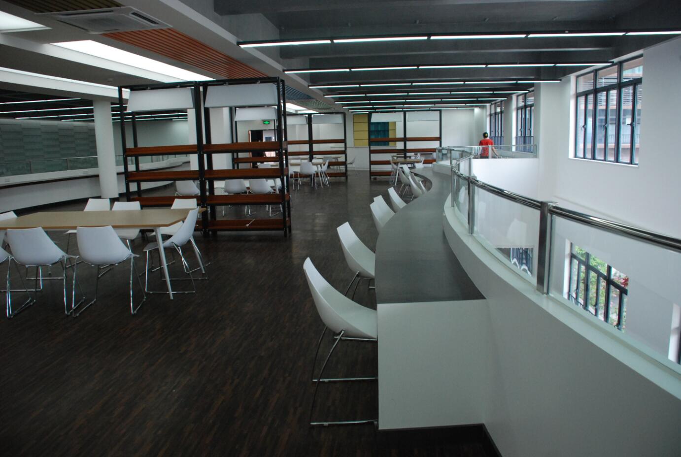 此外,圖書館(公共閱覽室)流線型的天花吊頂,五彩繽紛的書柜,色彩豐富,空間多變,弧形欄桿線條流暢,凹凸有致的造型文化墻交錯有序,獨具匠心。視聽教室鋁方通天花則運用了大面積的白色、綠色、青色、橙色進行空間分隔,色彩明快亮麗;由于空間有限,建藝集團重新對視聽設備、燈具、空調系統、消防設備進行排布,從而達到功能齊全、布置整齊、美觀的效果。天花設計了U型通透式鋁吊頂結構,巧妙地掩蓋了鋼結構轉換層,達到了整體一致的的完美視覺效果。
