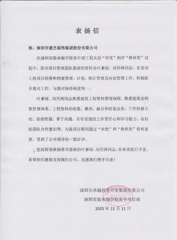 日前,建藝集團(tuán)工程管理中心資料員葉素綠、劉丹在負(fù)責(zé)深圳實(shí)驗(yàn)承翰學(xué)校高中部工程的資料檔案管理、計劃、統(tǒng)計管理及內(nèi)業(yè)管理工作期間,工作積極主動,憑借強(qiáng)烈的工作責(zé)任心與團(tuán)隊合作意識,獲得了項目部的一致認(rèn)可,受到通報表揚(yáng),體現(xiàn)出了建藝人的敬業(yè)精神,并為該工程順利通過“省優(yōu)”及“魯班獎”評獎資料復(fù)查做出了突出貢獻(xiàn)。