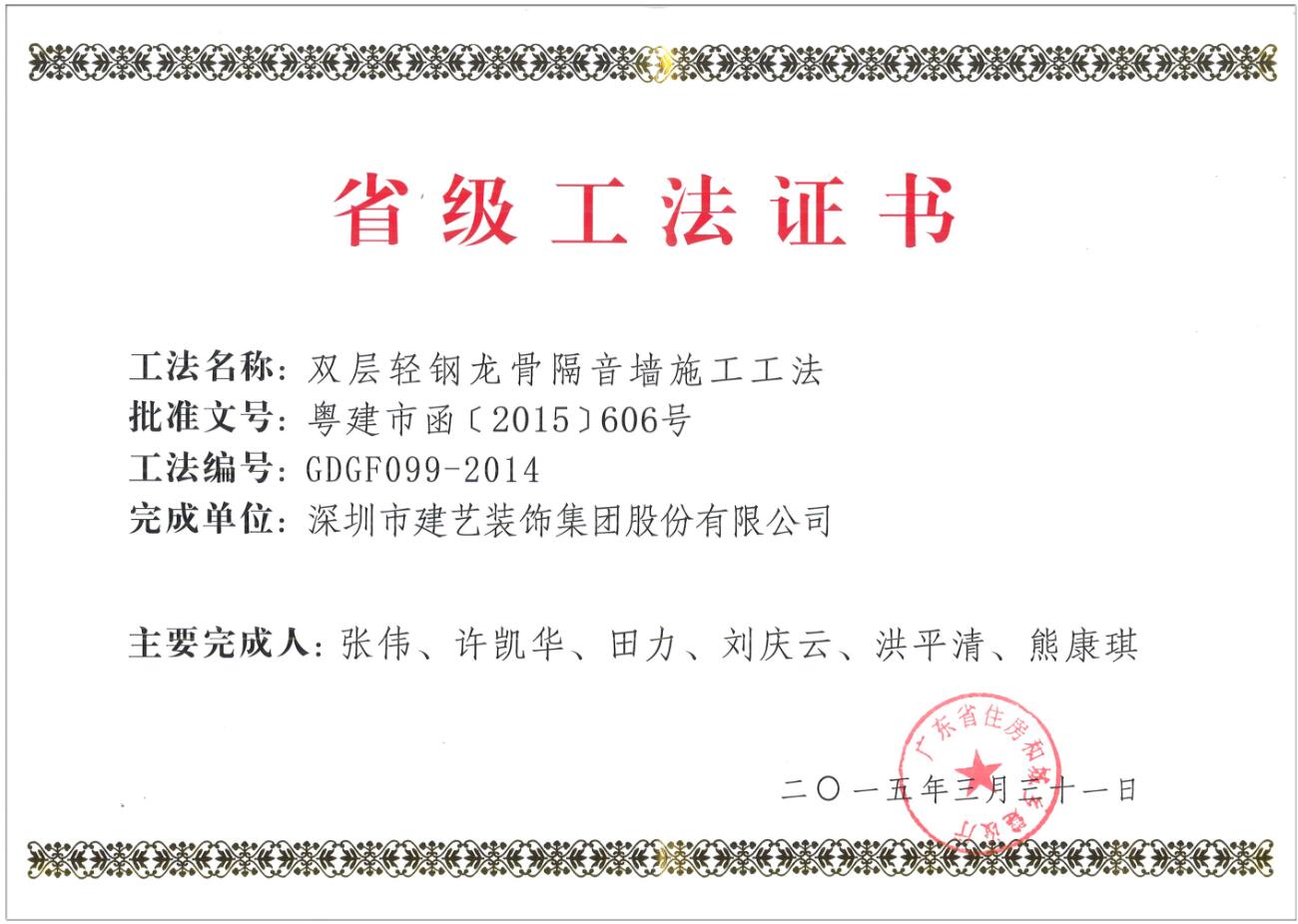 建藝集團“雙層輕鋼龍骨隔音墻施工工法”省級工法證書