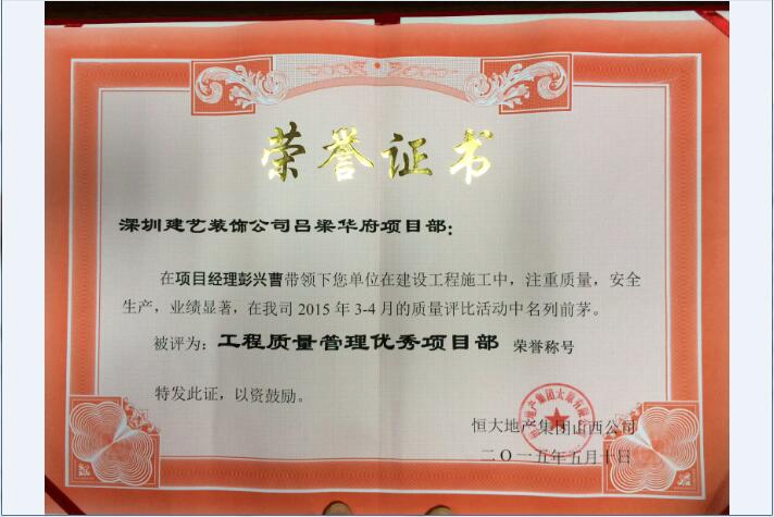 建藝集團恒大項目部獲“工程質量管理優秀項目部”榮譽稱號
