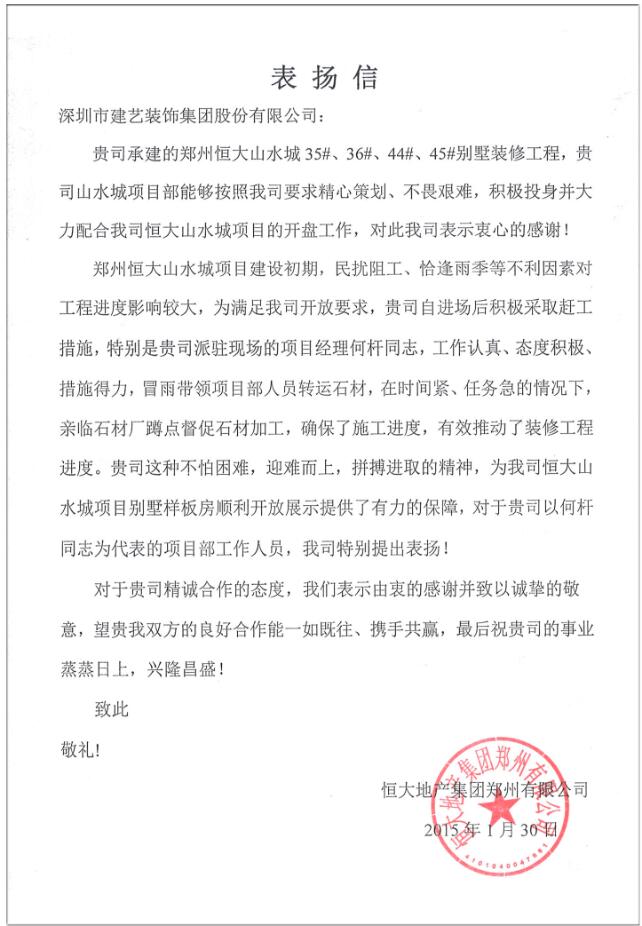 建藝集團鄭州恒大山水城項目部獲得業主方高度表彰