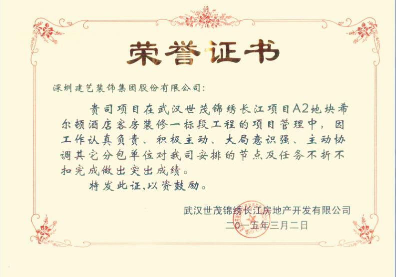 關于武漢世茂錦繡長江項目A2地塊希爾頓酒店客房裝修一標段工程的榮譽表彰證書