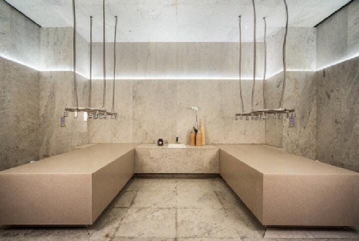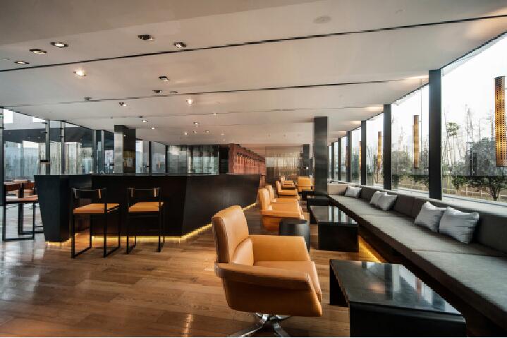 二層與中空大堂相鄰的休息廳中,四十米長、四米高的巨型木制鏤空花格折疊屏風,既是裝飾又把休息廳與大堂朦朧的分割開來,隱約可見。兩側墻面選用了中國古老的算盤珠制作的造型,貫穿著簡約中式的設計美感。
