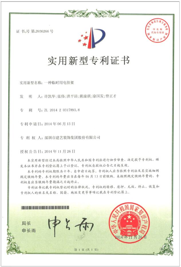 近日,建藝集團在知識產權領域再攀新高峰,集團自主研發的六項實用新型專利先后獲得國家知識產權局的正式授權。該六項專利分別為: