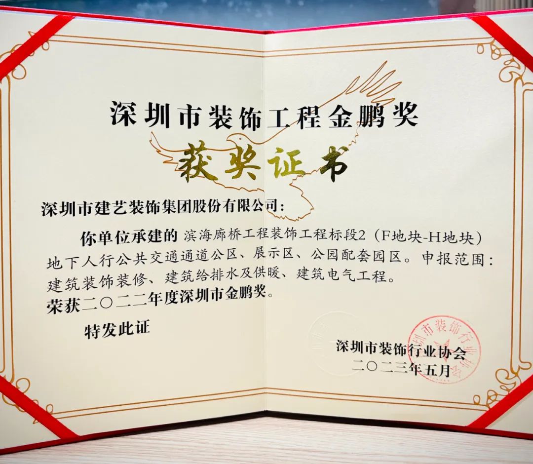 近日,由深圳市裝飾行業(yè)協(xié)會主辦的深圳市裝飾工程金鵬獎評審結(jié)果通知,建藝集團(tuán)承建的濱海廊橋裝飾工程標(biāo)段2(F地塊-H地塊)工程榮獲“2022 年度深圳市金鵬獎”。