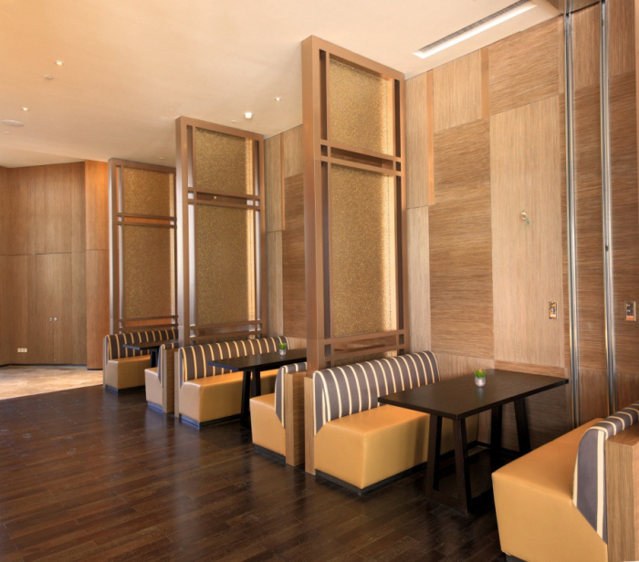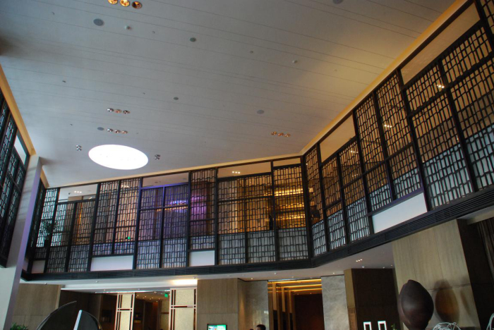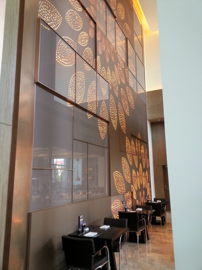 大堂咖啡廳和全日餐廳采用了金箔亞克力屏風裝飾。這種屏風是在二片亞克力板中間加入大量的金箔小方片后壓制而成。由于金箔小片呈無規則分布狀態,故每一塊屏風隨著光線的變換均呈現不同的折射效果,裝飾效果極佳。該種材料市面上較為少見,售價較高。
