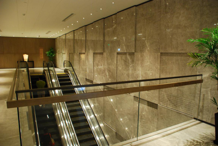 大堂自動扶梯旁的裝飾墻面高度達7.5米,采用不規則藝術造型石材墻面施工工藝。在造型中把面加進了一定量的維度,如凸出一些、凹進一些,產生半立體之感,造成空間流動效果,增強空間的柔美、親切的氣氛感,給人以富麗堂皇、豪華之感,產生強烈的藝術感染力。