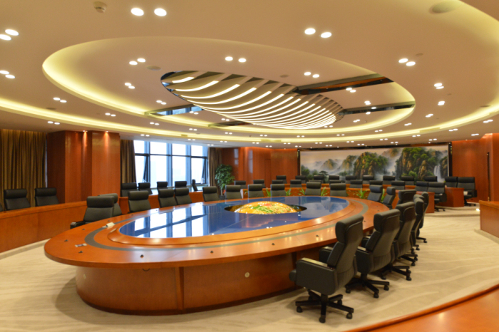 總部會(huì)議室,天花造型設(shè)計(jì)與家具擺設(shè)相呼應(yīng),完美如畫。