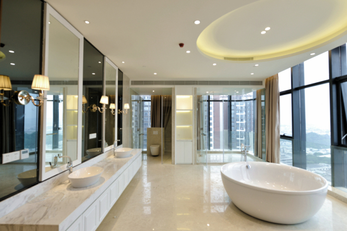 華耀城頂層是以五星級(jí)酒店標(biāo)準(zhǔn)裝修的客房,專為接待尊貴客人而準(zhǔn)備??偨y(tǒng)套房設(shè)有吧臺(tái),寬敞到可以繞著大浴缸騎自行車的浴室,且浴室專門設(shè)有桑拿室。豪華的裝修不僅彰顯了企業(yè)的實(shí)力與氣勢(shì),更是凸顯了對(duì)客人的尊重。