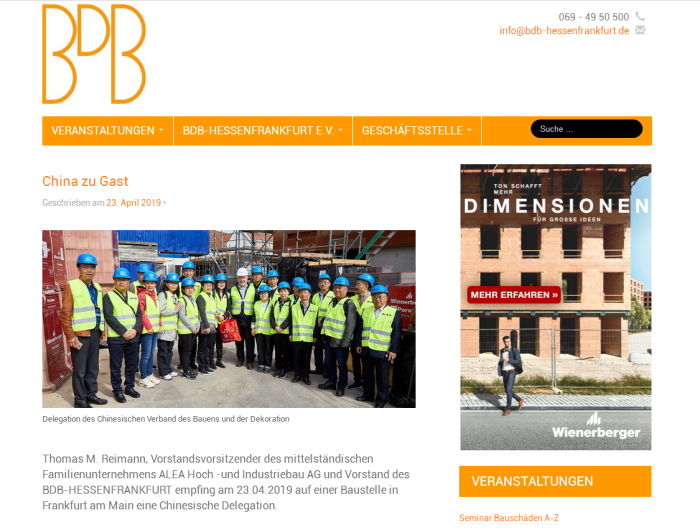 參觀交流活動結束后,德國聯邦建筑及建筑工程師協會——黑森州分會(BDB)在其官網bdb-hessenfrankfurt.de上對本次交流活動進行了專門報道。