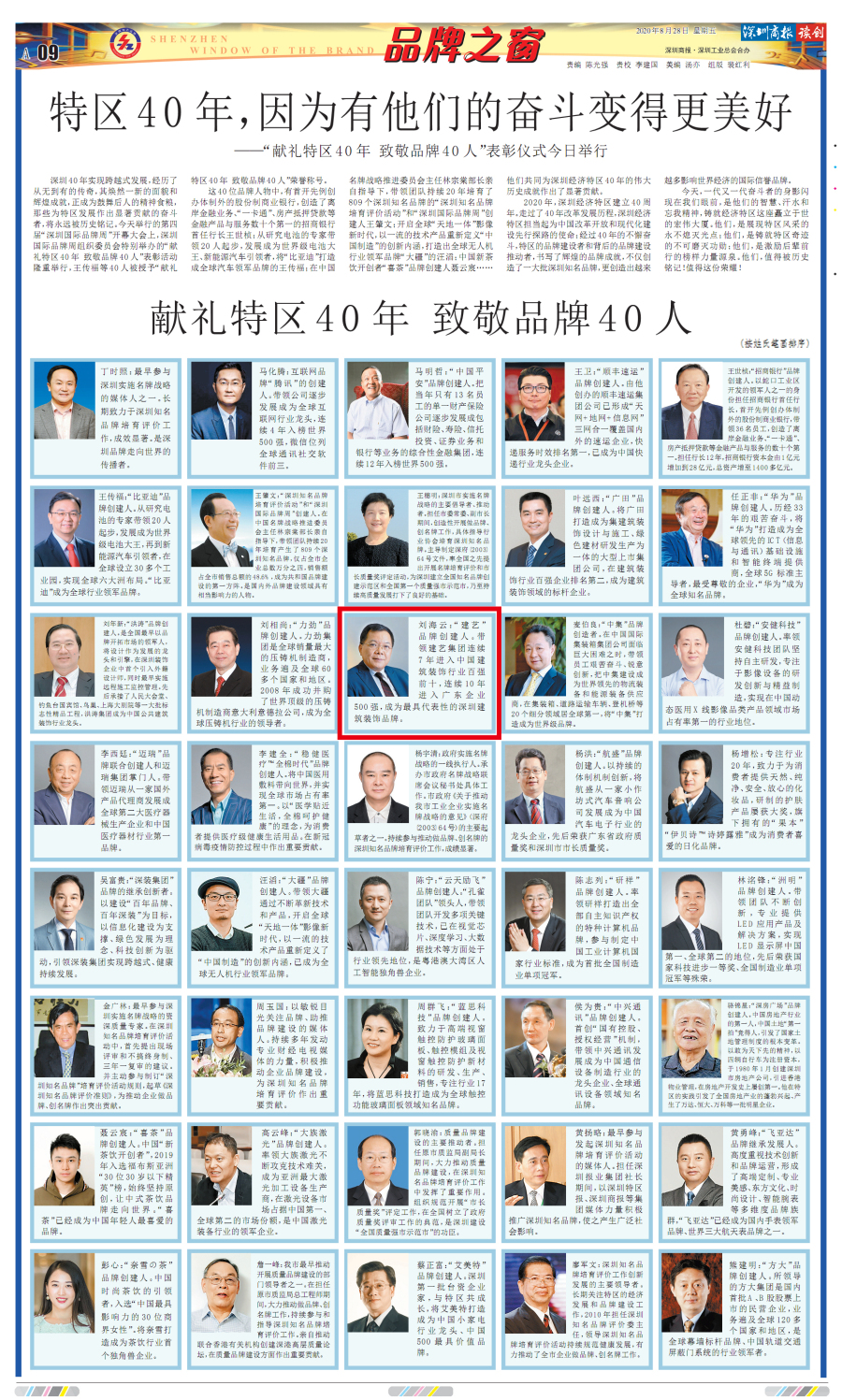 建藝集團董事會主席劉海云等40人獲“獻禮特區40年 致敬品牌40人”榮譽稱號2020年是深圳經濟特區建立40周年。回顧特區40年的發展歷程,深圳能實現跨越式發展,經歷從無到有的傳奇,離不開一代又一代奮斗者的辛勤付出。以比亞迪、邁瑞、大疆、建藝等為代表的品牌企業從無到有,再到蜚聲國際,共同構筑起深圳的城市經濟體系和國際市場地位,為深圳經濟特區實現歷史性變革貢獻了重要力量。